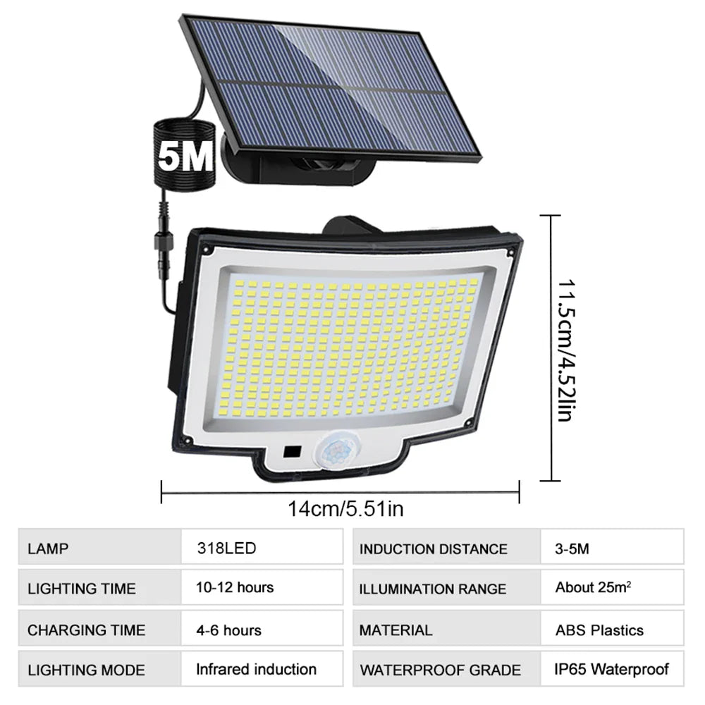 - Ultra-bright 318LED array offers up to 270° wide-angle illumination, casting over 2500 lumens of daylight-quality light to cover large outdoor areas.